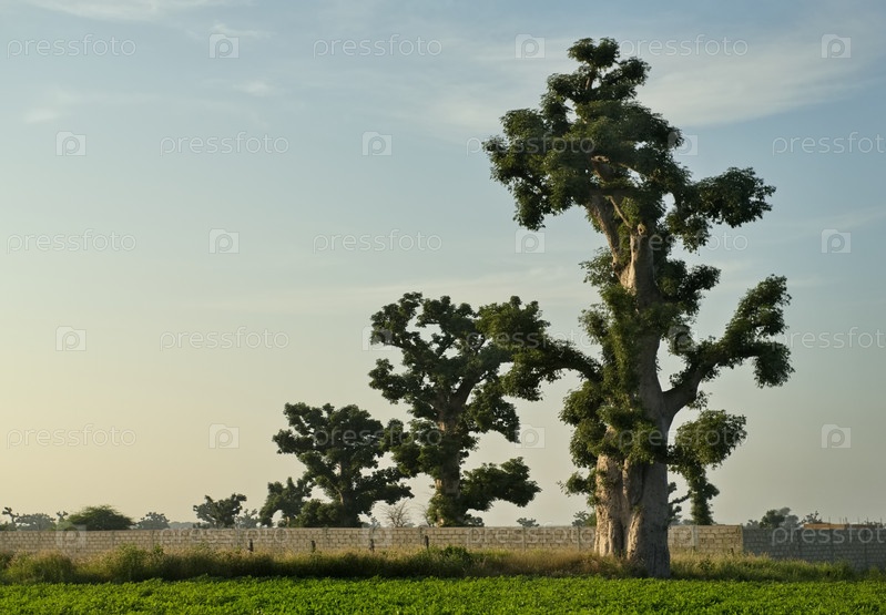 Западная Африка. Сенегал. Живописная панорама с одинокими огромными баобабами на арахисовом поле в лучах заходящего солнца