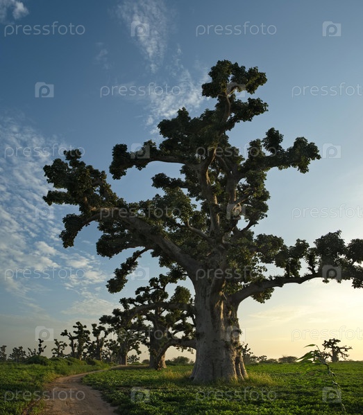 Западная Африка. Сенегал. Живописная панорама с одинокими огромными баобабами на арахисовом поле в лучах заходящего солнца