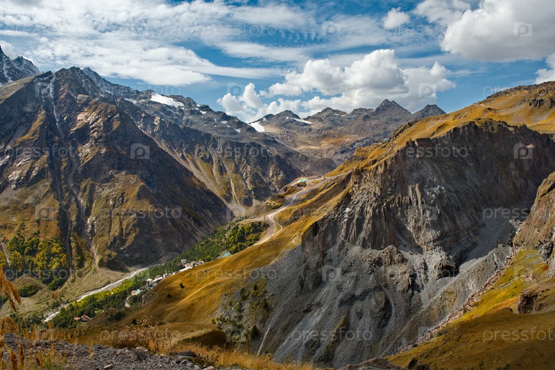 Россия. Северный Кавказ. Потрясающий вид на вершины Кавказского хребта у подножья горы Эльбрус, высочайшей горы Европы