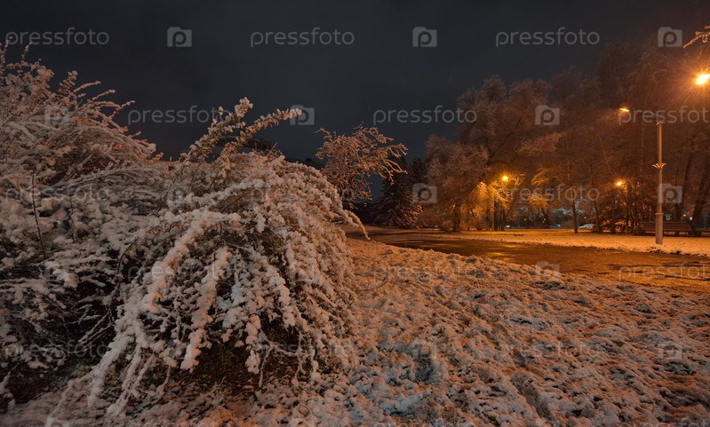 Новокузнецк, Россия. 01 ноября 2024 года. Живописный вид на деревья городского парка, покрытые первым осенним снегом и подсвеченные фонарями теплого и холодного света