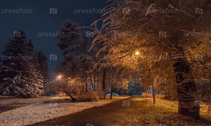 Новокузнецк, Россия. 01 ноября 2024 года. Живописный вид на деревья городского парка, покрытые первым осенним снегом и подсвеченные фонарями теплого и холодного света