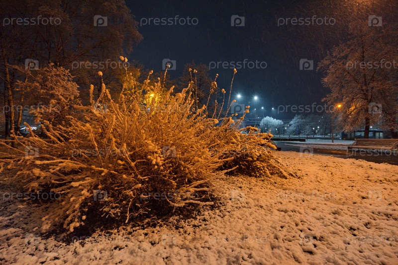 Новокузнецк, Россия. 01 ноября 2024 года. Живописный вид на деревья городского парка, покрытые первым осенним снегом и подсвеченные фонарями теплого и холодного света