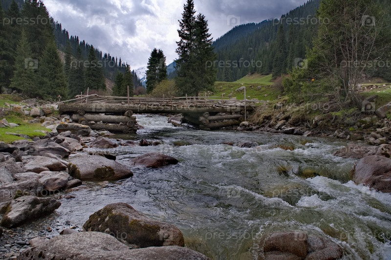 Кыргызстан, восточный берег озера Иссык-Куль. Вид на степную долину реки Арашан с деревянным мостом в окружении редких елей