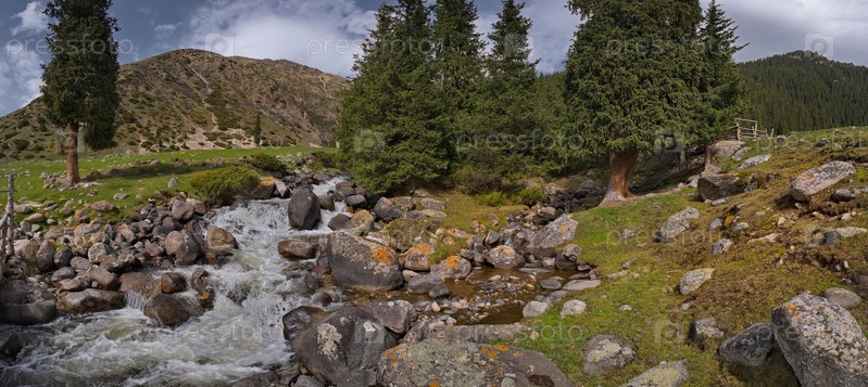 Кыргызстан, восточный берег озера Иссык-Куль. Вид на степную долину реки Арашан с деревянным мостом в окружении редких елей