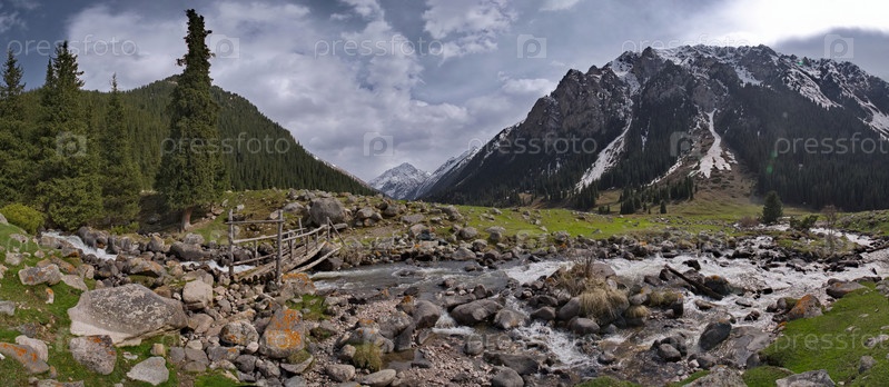 Кыргызстан, восточный берег озера Иссык-Куль. Вид на степную долину реки Арашан с деревянным мостом в окружении редких елей