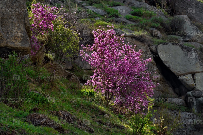 Горный Алтай в период цветения рододендрона (Rhododendron Ledebourii) в районе поселка Купчегень на Чуйском тракте