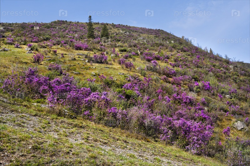Горный Алтай в период цветения рододендрона (Rhododendron Ledebourii) в районе поселка Купчегень на Чуйском тракте