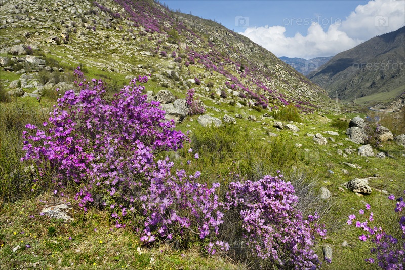 Горный Алтай в период цветения рододендрона (Rhododendron Ledebourii) в районе поселка Купчегень на Чуйском тракте