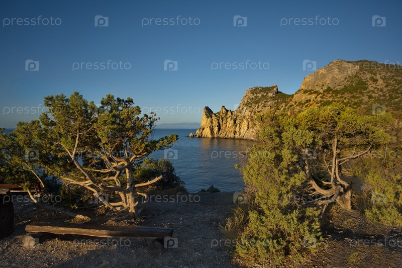 Россия, Новый Свет. Потрясающий рассветный вид с мыса Капчик на окружающую бухту Крымского полуострова