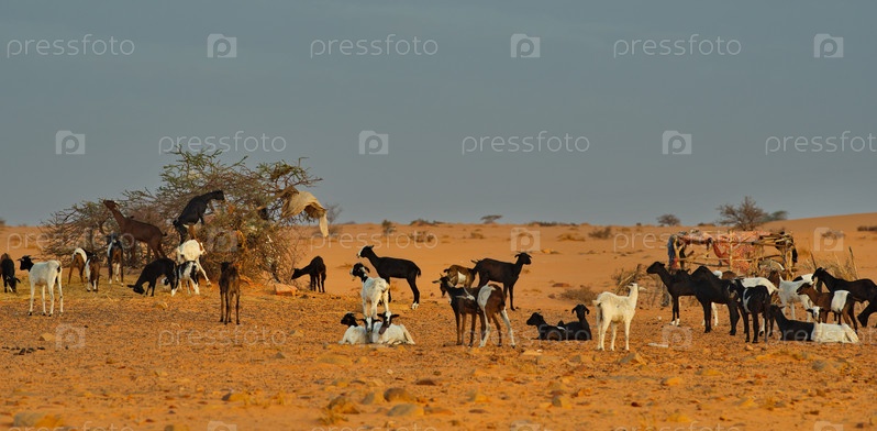 Западная Африка. Мавритания. Стадо коз пасется в пустыне Сахара, в которой почти нет растительности