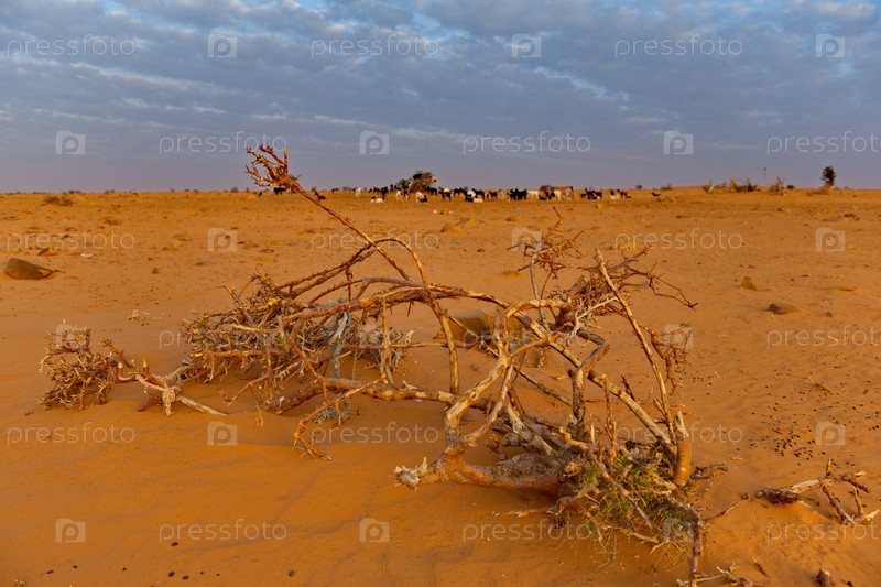 Западная Африка. Мавритания. Стадо коз пасется в пустыне Сахара, в которой почти нет растительности