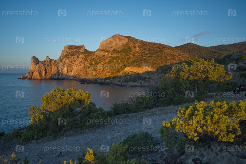 Россия, Новый Свет. Потрясающий рассветный вид с мыса Капчик на окружающую бухту Крымского полуострова