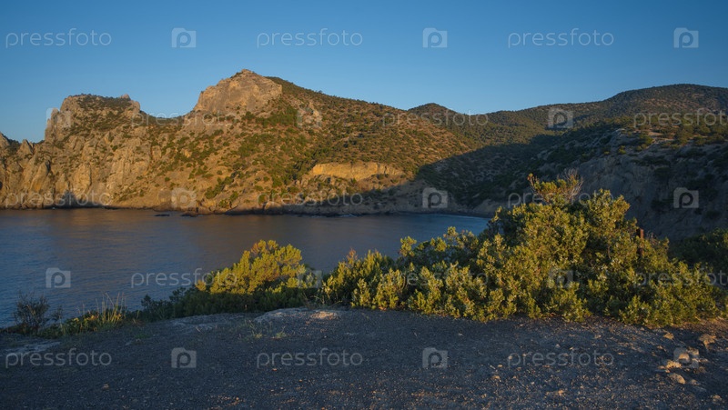Россия, Новый Свет. Потрясающий рассветный вид с мыса Капчик на окружающую бухту Крымского полуострова