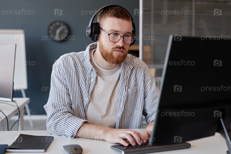 Портрет человека, носящего наушники и работающего на экране компьютера