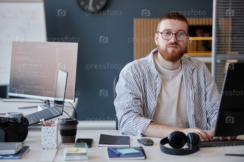 Портрет бородатого человека, работающего в современном офисе