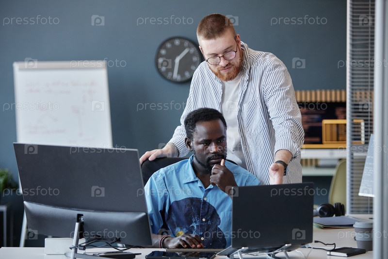 Обсуждение работы над проектом во время офисной встречи двух коллег