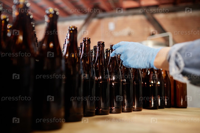Рука производственного работника, идущего забрать стеклянные бутылки на заводе по производству сидра