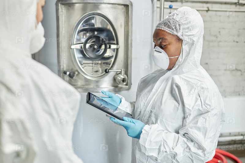 Процессовый техник-женщина в униформе использует планшет во время проверки завода внутри