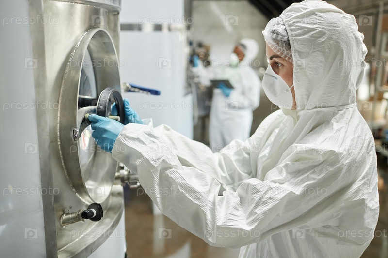 Женщина-оператор поворачивает клапан на баке, инспектируя производство пива в помещении