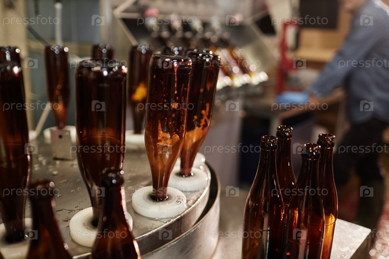 Стерилизованные стеклянные бутылки на очистной машине в заводе по производству сидра или пива