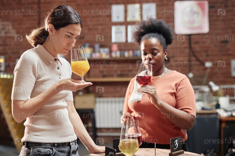 Две женщины-соммельеры отбирают образцы ремесленного сидра во время дегустации в фабричном подвале