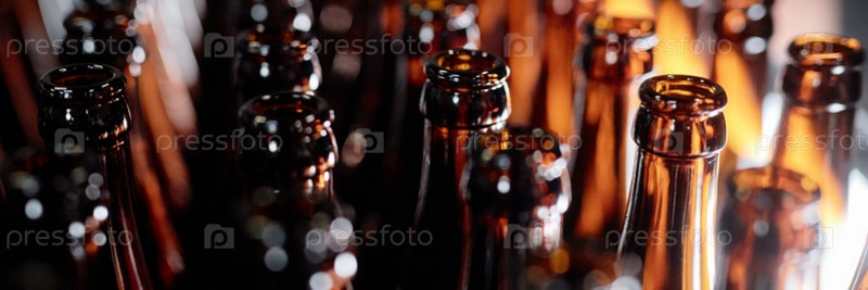 Заголовок изображения партии коричневых стеклянных бутылок, стоящих в очереди на фабрике ремесленного сидра