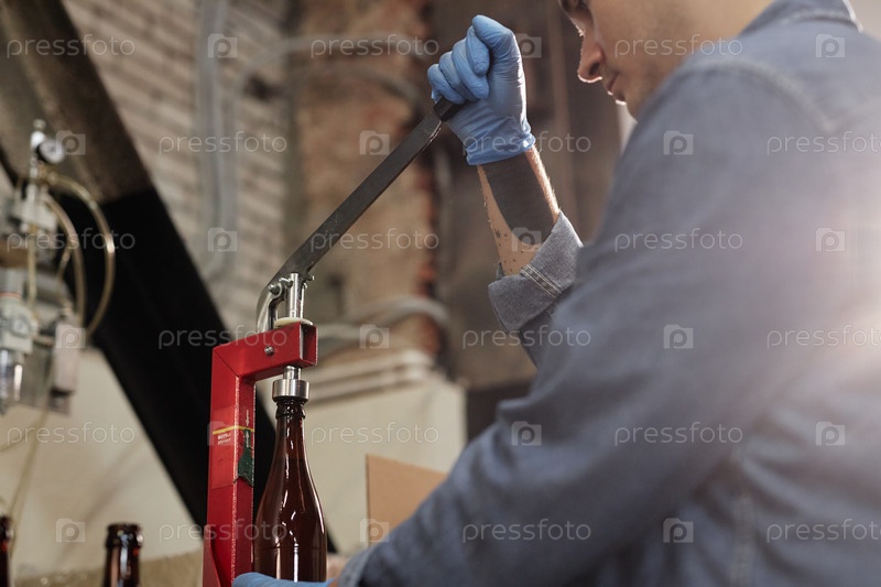 Рука мужского оператора производства, использующего бутылочный капер в мастерской на пивоваренном заводе