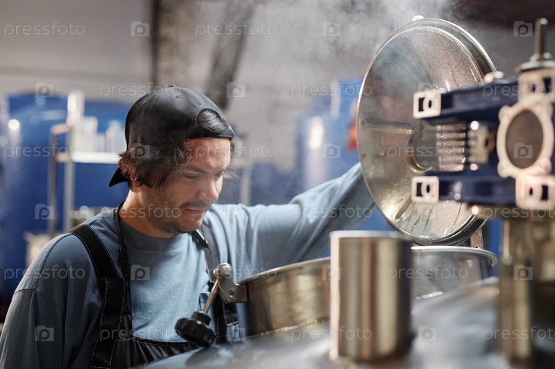 Мужчина-работник пивоварни Открытие крышки резервуара Мониторинг процесса приготовления пива в помещении