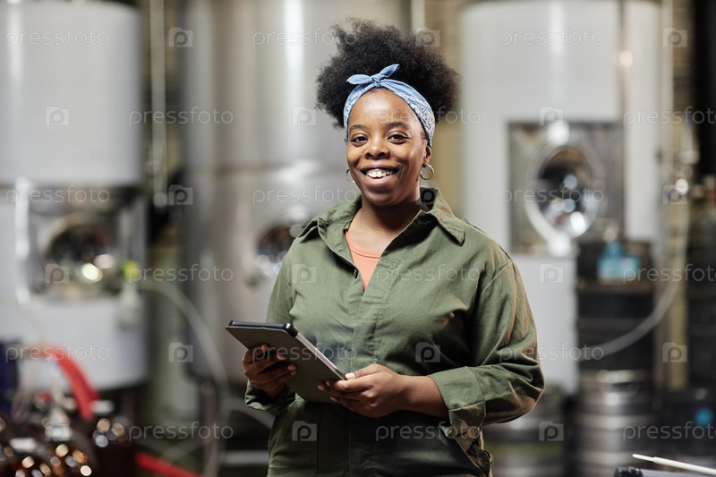 Портрет улыбающейся женщины-процессуального руководителя, использующего цифровые планшеты для проверки производства в помещении