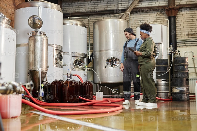 Производственный оператор и женщина-техник проверяют резервуары с сидером в помещении Мужчина
