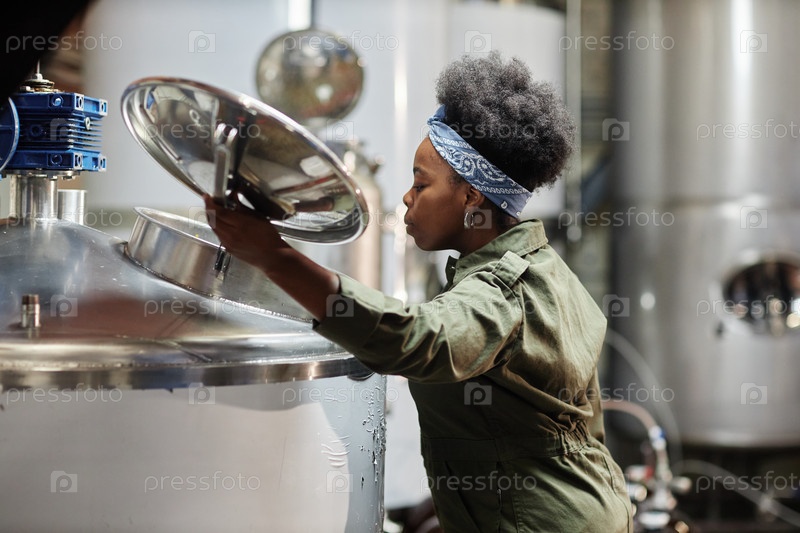 Женщина-процессовый техник Открытие крышки резервуара Мониторинг пастеризации сидра на фабрике
