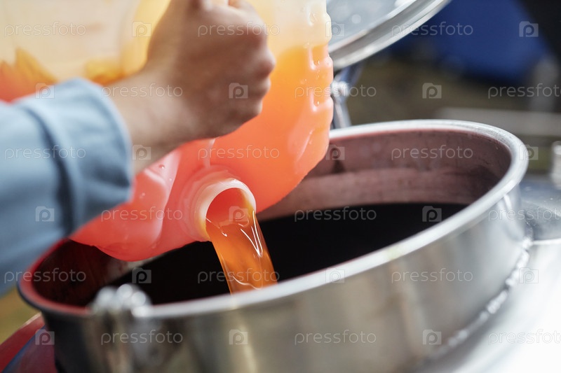 Руки человека, заливающего жидкость в бак во время приготовления сидра на фабрике