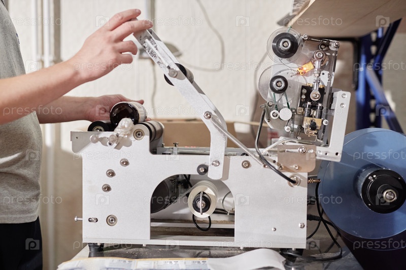 Руки работника, использующего оборудование для нанесения ярлыков на пищевой фабрике