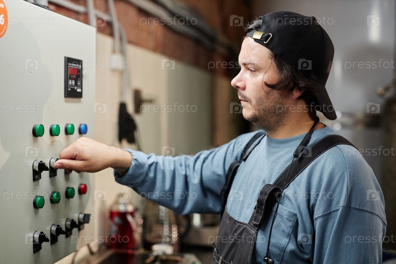 Работник пищевой промышленности регулирует машину во время работы оборудования в мастерской