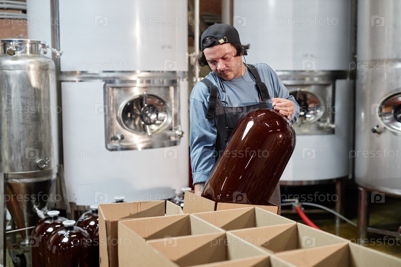 Производственный работник упаковывает большие бочки сидра или пива в коробки на фабрике