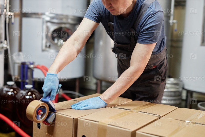 Работник по производству сидра записывает коробки с кегами внутри мужского пола