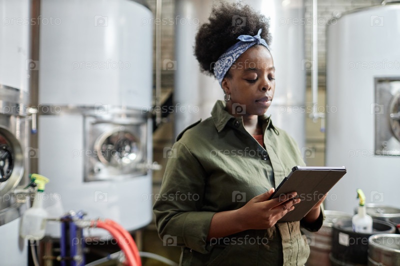 Женщина-начальник производства, использующая планшет в мастерской завода по производству сидра или пива