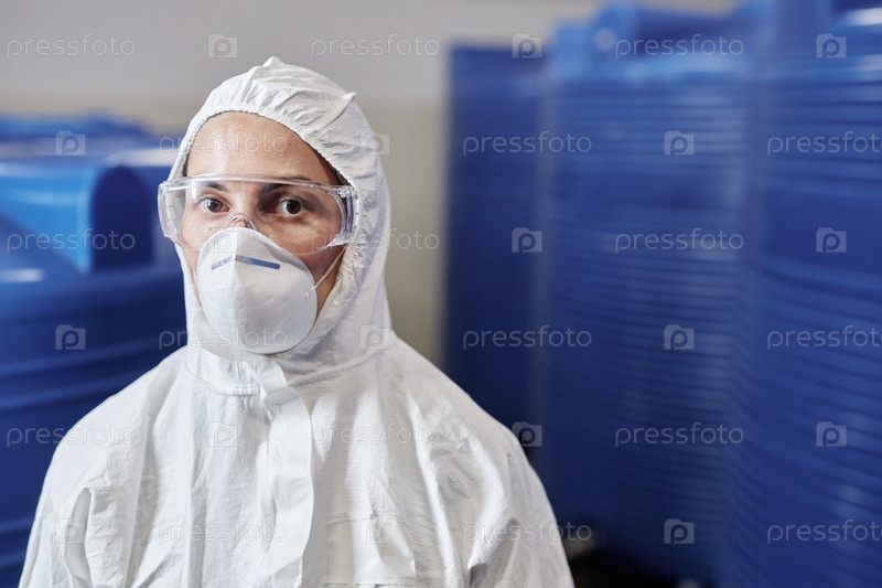 Портрет женщины-техника в маске и очках на химической фабрике