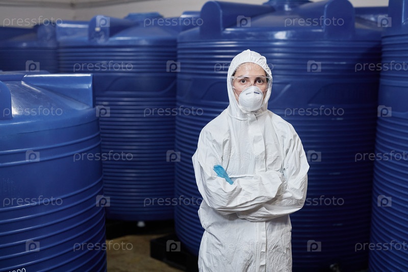 Портрет женщины-техника в маске, позирующей на химической фабрике