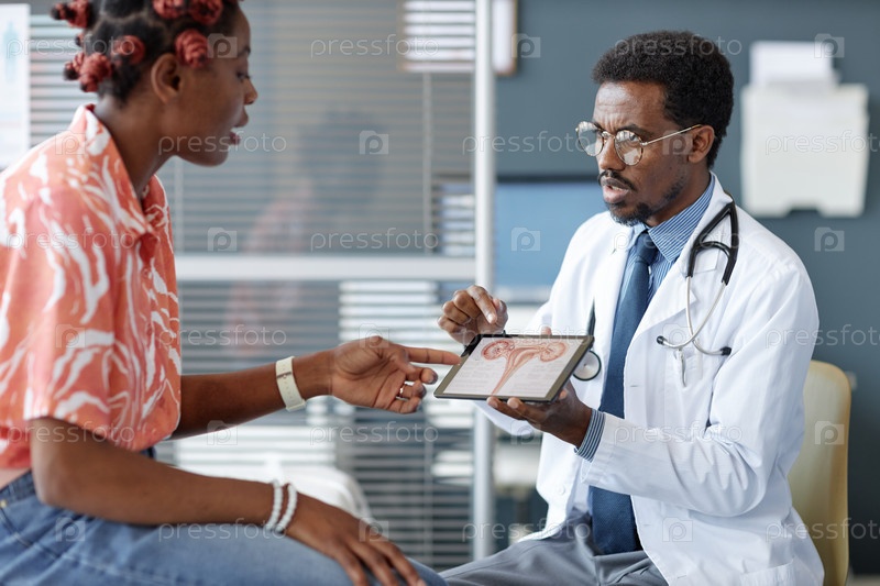 Obgyn Holding Tablet с женской репродуктивной системой в руках мужчины