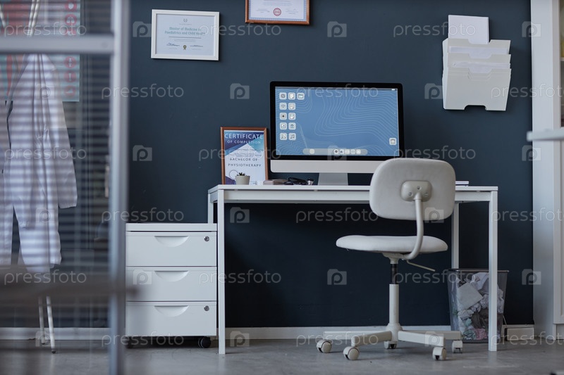 Рабочее место в медицинской клинике с компьютером на столе против голубой стены