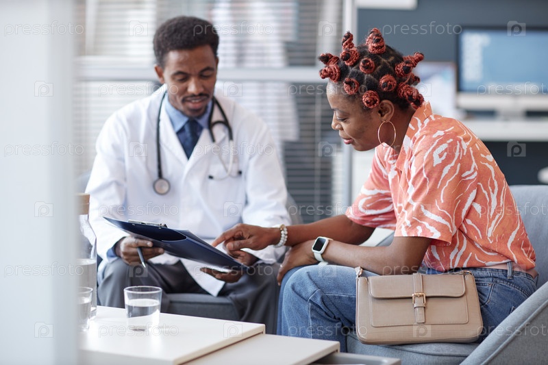 Черная женщина с фанковой прической в консультации, указывая на клипборд