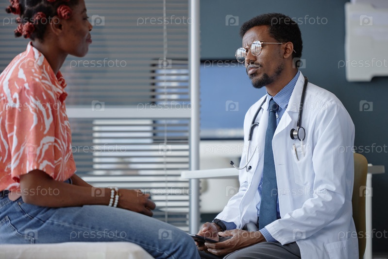 Заботливый чернокожий врач, носящий очки, слушающий женщину-пациента