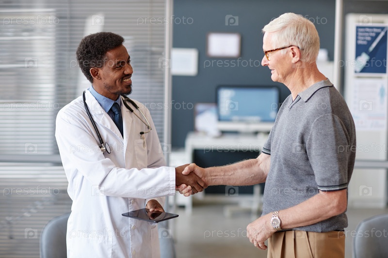 Улыбающийся чернокожий врач приветствует пожилого пациента-мужчину, рукопожатие в клинике