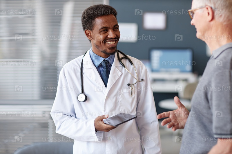 Улыбающийся черный доктор, держащий планшет, разговаривает с пожилым пациентом-мужчиной в клинике