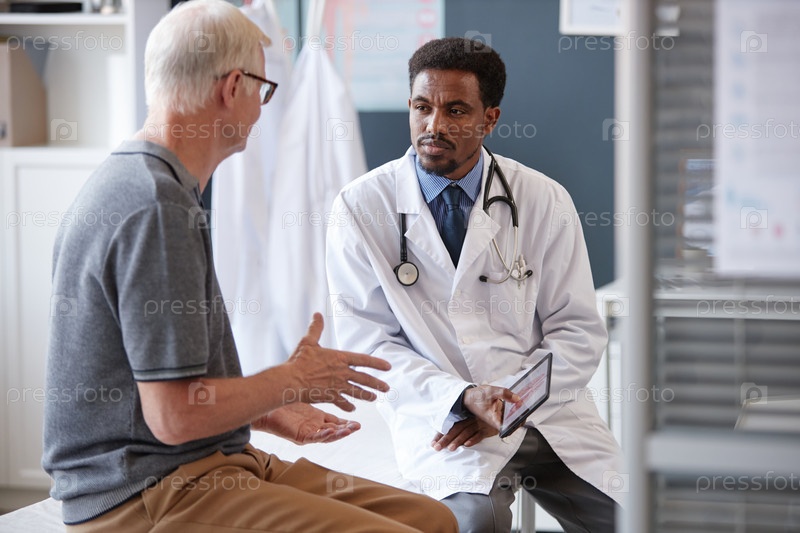 Серьезный чернокожий доктор держит планшет, слушая старшего пациента в дискуссии