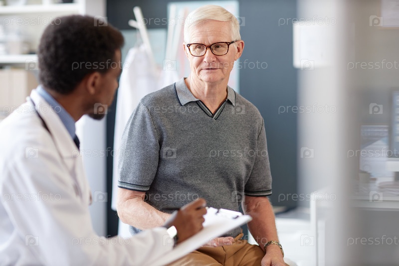 Пожилой мужчина разговаривает с врачом на консультации, объясняя симптомы проблемы со здоровьем