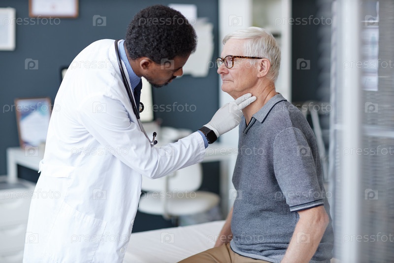 Сцена чернокожего врача, пальпирующего шею пациента на обследовании