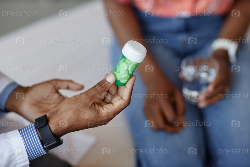 Ближайшее изображение черного доктора, держащего бутылку с таблетками в консультации