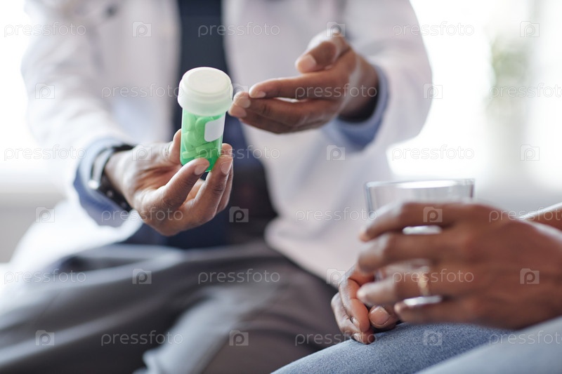 Ближайшее изображение черного доктора, держащего бутылку с рецептурными таблетками